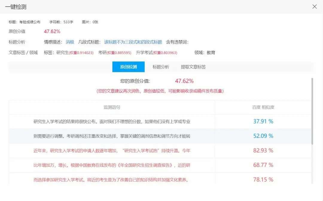 但是当我们用之前《易撰》的原创性检测工具再检测时,却只有 47% 的原创度,看来 AI 写作也免不了是东拼西凑,并且仔细看这篇文章的段与段之间也缺乏衔接。