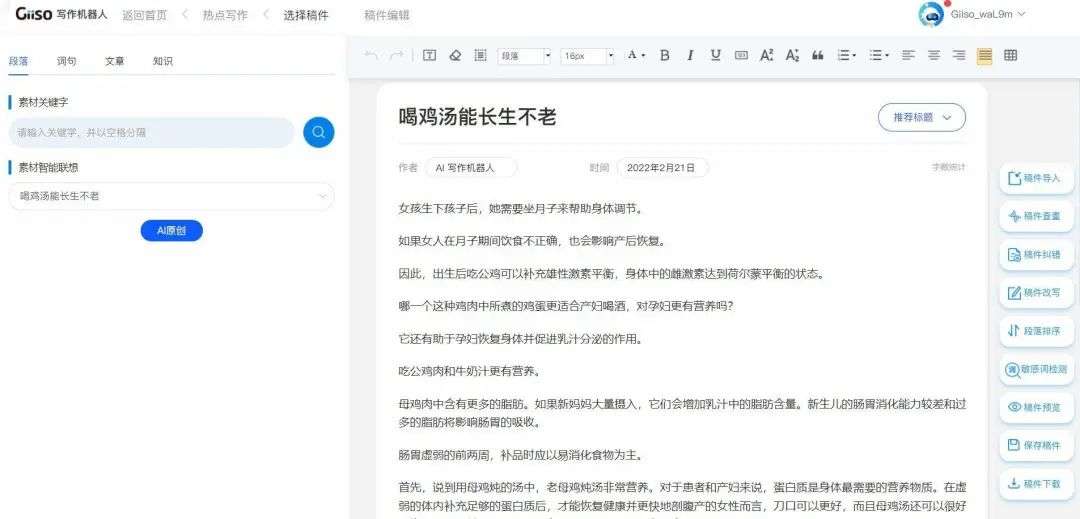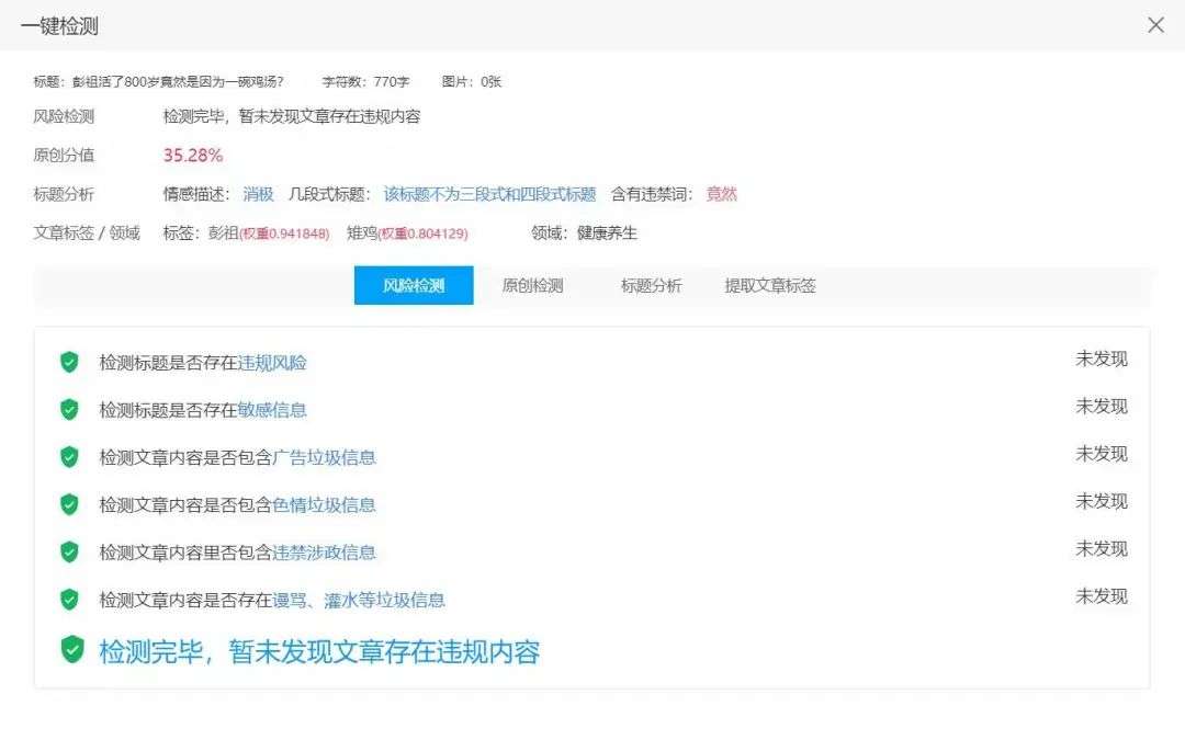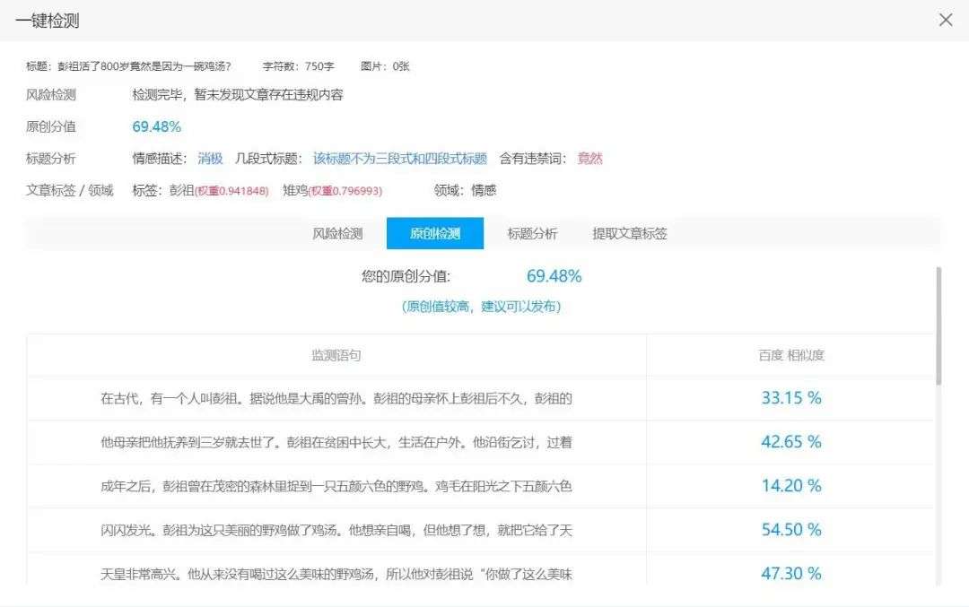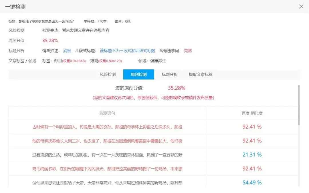 随便从网上找了一篇名为《彭祖活了 800 岁竟然是因为一碗鸡汤?》的真正论证喝喝鸡汤长生不老的文章丢进去检查。从反馈结果看,文章尚算规范,就是原创度较低。