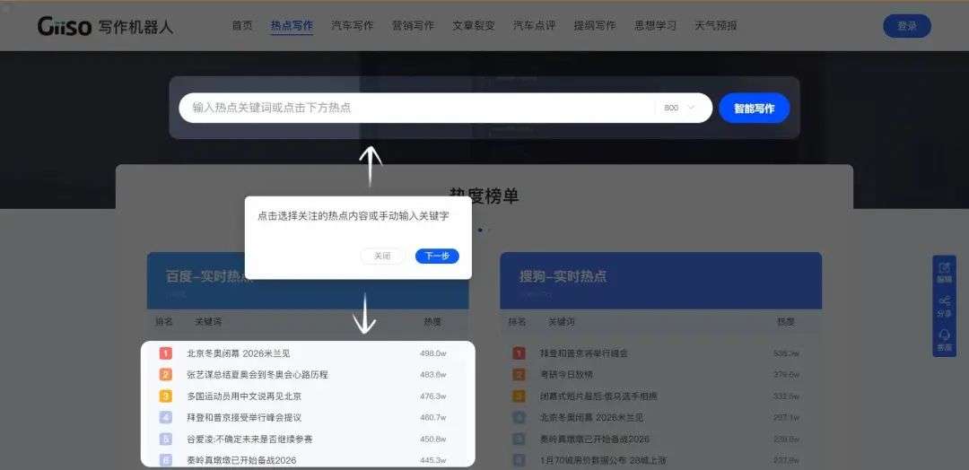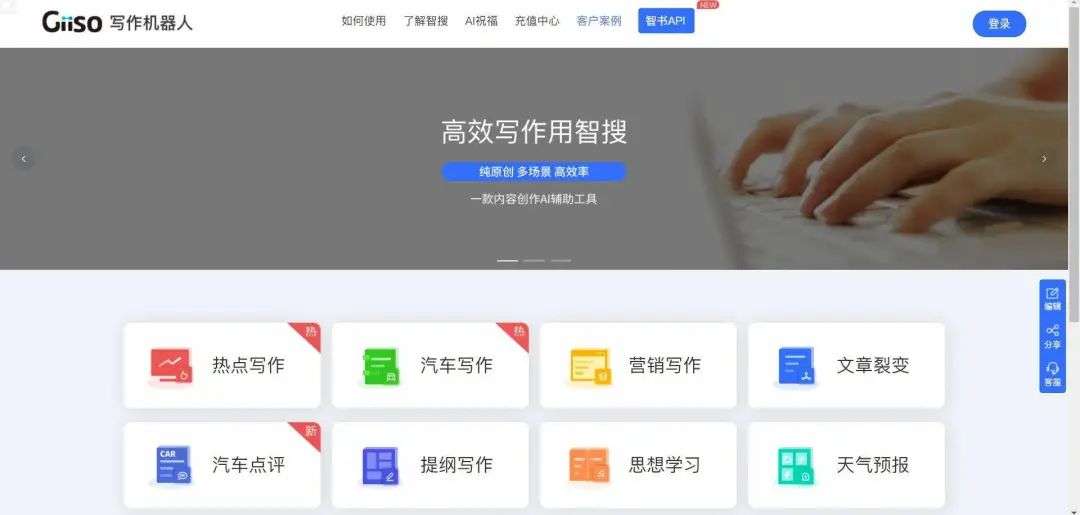 看来太简单的东西只能用来娱乐,生成的文章上不了台面,接下来唯有尝试使用更加复杂一点的智能写作工具了。当发现《GIISO 写作机器人》的时候,它干净简洁、指向明确的卡片式主页立刻引起了我的兴趣。