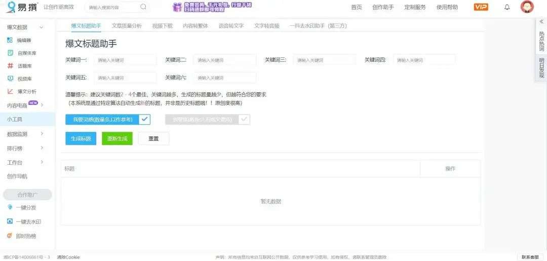 万事开头难,写文章的第一步常常是想标题,打开第一款测试的工具——《易撰》,让我们饱含期待地看看它能给出什么让人眼前一亮的标题。