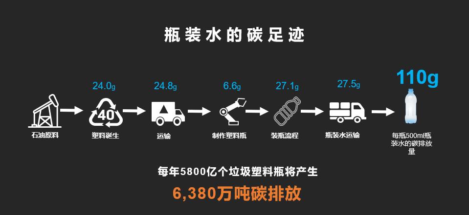再说碳排放。美国环境署研究,饮用水的包装瓶从石油化工行业到制成塑料,再到灌装水,运输,最终抵达消费端,要造成大量碳排放。如果在本地产销,一瓶水会带来110克碳排放。如果是进口水,一瓶水则带来200到300克碳排放。把5000亿瓶水放在一块,会带来接近6,000万吨的二氧化碳排放。我们喝瓶装水,其实是一边在喝,一边在制造二氧化碳。