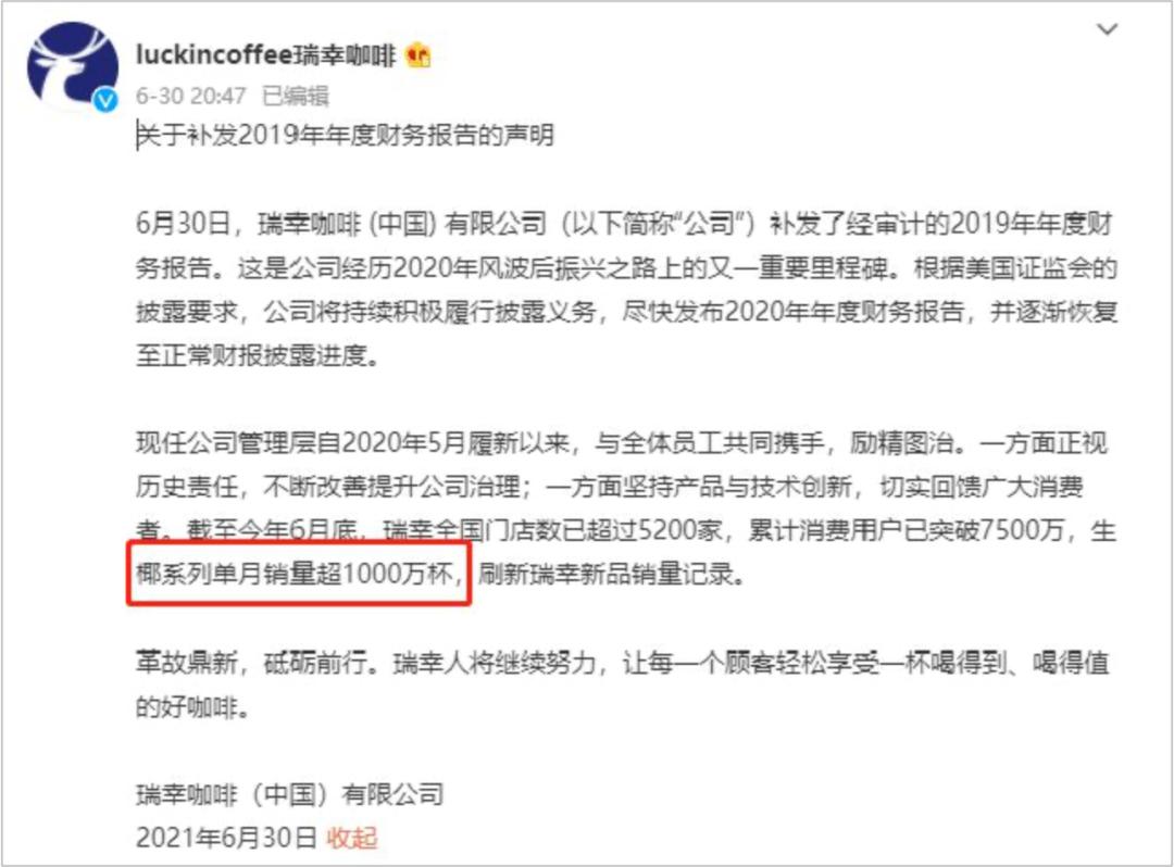 生椰系列产品的单月销量甚至超过 1000 万杯,刷新了瑞幸咖啡的新品销售记录。