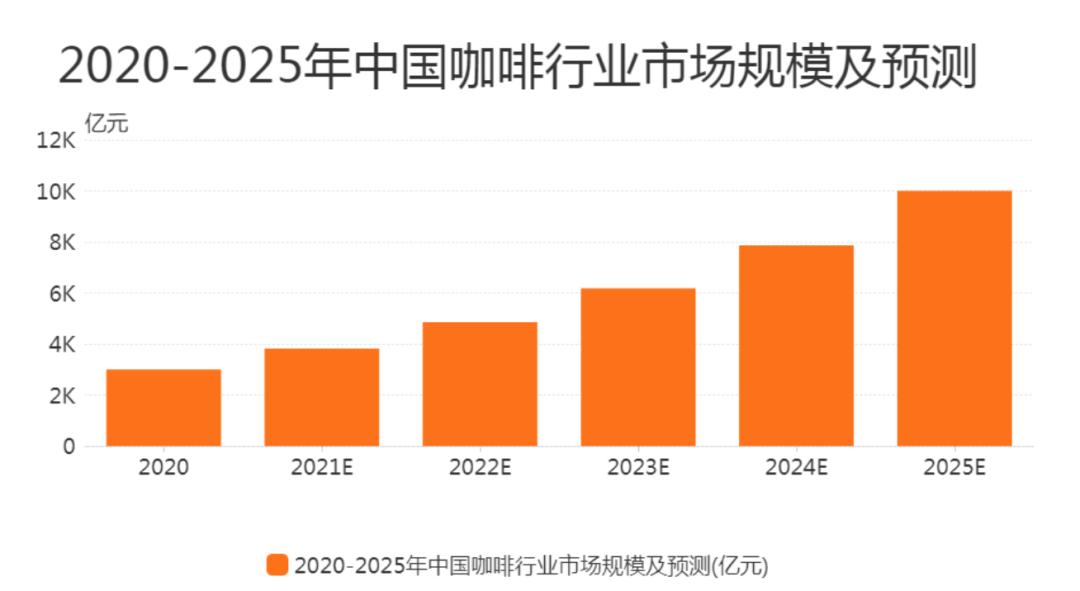 艾媒咨询的数据显示,2021 年中国咖啡市场规模达 3817 亿元,预计行业将保持 27.2% 的增长率上升,2025 年中国咖啡市场规模将达 10000 亿元。