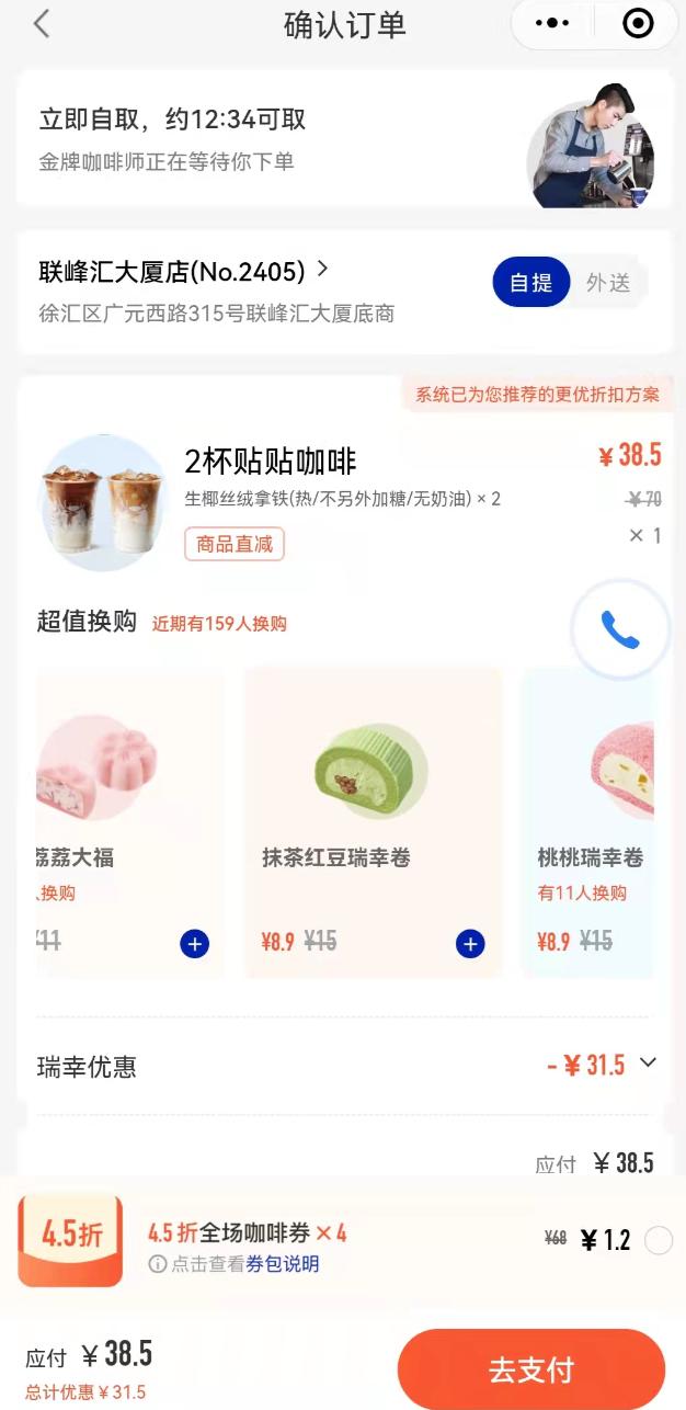 当用户进入结算界面以后,瑞幸会在此提供几款「超值换购」,比如原价 12 块的经典麻薯只要 6.9 块,原价 15 块的抹茶红豆瑞幸卷只要 8.9 块。