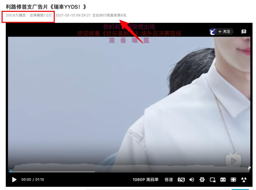 相关的《瑞幸YYDS》视频,也在微博得到超过 600w 的播放量。同时,B 站内该视频也被利路修的粉丝推上热门,获得 100w+ 的播放量。