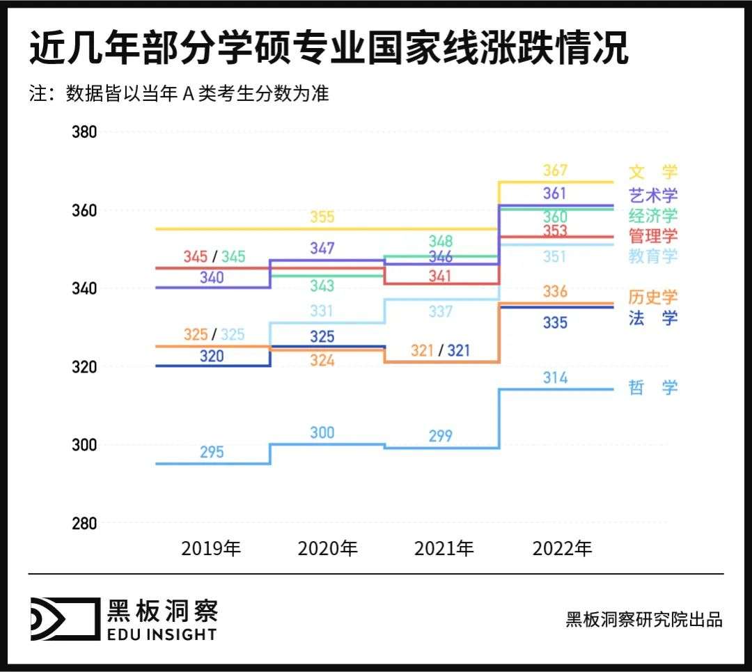分数普遍上涨的同时,国家线也随之提高。3 月中上旬,2022 年考研国家线公布。数据显示,除少数专业外,分数线普遍大幅上涨,其中有些专业涨幅已超过 10 分。以学硕专业为例,哲学、历史学、艺术学涨幅最大,达到 15 分;教育学、法学两门专业次之,上涨 14 分;经济学、文学、管理学等专业也普涨 12 分。值得注意的是,往年国家线的上下浮动分数基本在 5 到 10 分左右,今年已超过往年平均水平。可见,分数在今年考研上的巨大变化,“贬值化”趋势尤为明显。