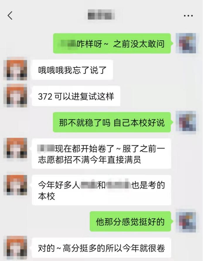 一位初试 370 多分的考生无奈表示,今年真是太卷了,之前学校志愿都招不满,今年直接满员。按往年来说,我的成绩在报考院校专业里应该算排名比较靠前的,复试压力也不大。而今年这个情况,虽然成绩可以进入复试,但心里确实没什么底,高分挺多的。