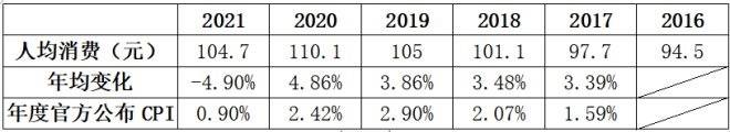 据国家统计局数据显示——近年来CPI年均增长在2-3%区间,虽2021年微增0.9%,但依然是增长的。而海底捞2021年人均消费却出现首次下降,且降幅逼近5%。