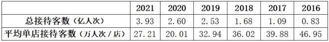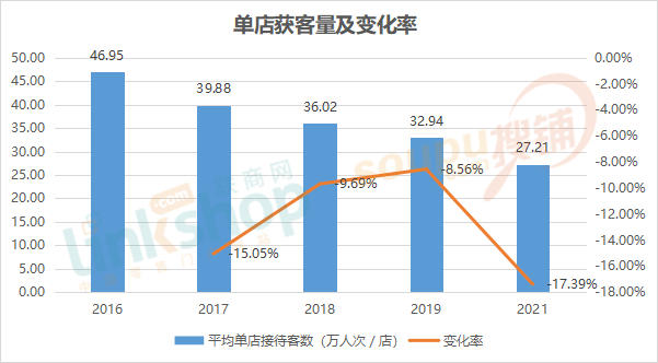 从营收及人均消费数据能推算出“年度获客总量及单店平均获客量”情况,从相关数据中可以看出——虽年度获客总量在2021年出现大幅增长(同比增长51.15%),但单店方面相较2019年及之前却出现大幅下滑(较2019年同比降低17.39%),且除却2020年受疫情严重影响外,整体呈逐年快速下降趋势。