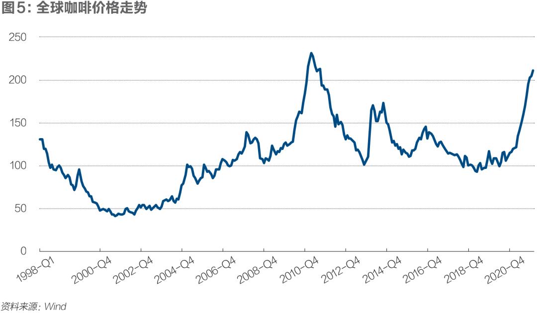 乳制品的去向之一就是咖啡馆,后者目前正面临牛奶和咖啡涨价的双重夹击。2021年,咖啡主产区、出产全球40%咖啡豆的巴西接连经历干旱和霜冻,导致产量急剧下滑。美国洲际交易所数据显示,咖啡期货价格自2021年起急速上涨,连带咖啡因价格同样飙升。
