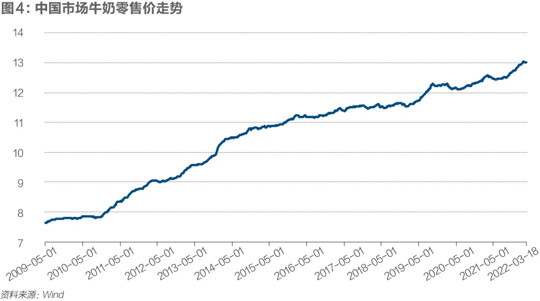 饲料价格的上涨也影响到了乳产品。据《乳业时报》报道,2021年奶牛饲料成本涨幅约30%。中国生乳自2020年开始涨价,目前已至相对高位。农业农村部数据显示,生乳价格已从2019年的3.5元/公斤上涨至目前的4.2元/公斤以上。