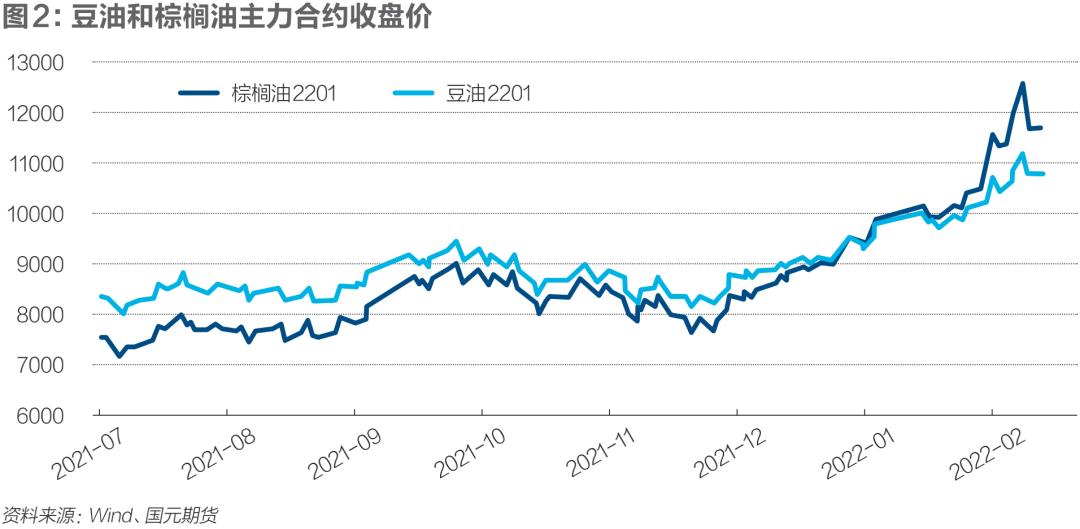 棕榈油价格也大幅上涨,不到四个月就从4500元/吨上涨到8000元/吨。浙商期货农产品分析师向博对《财经十一人》表示,植物油等油脂的工业属性明显,作为生物柴油原料,其波动和原油的相关性与日俱增,原油价格上涨,生物柴油价格随之上涨,油脂的价格波动节奏相似。近期俄乌冲突加剧了油菜籽、棕榈油等农产品的供需失衡,也推动价格上涨。