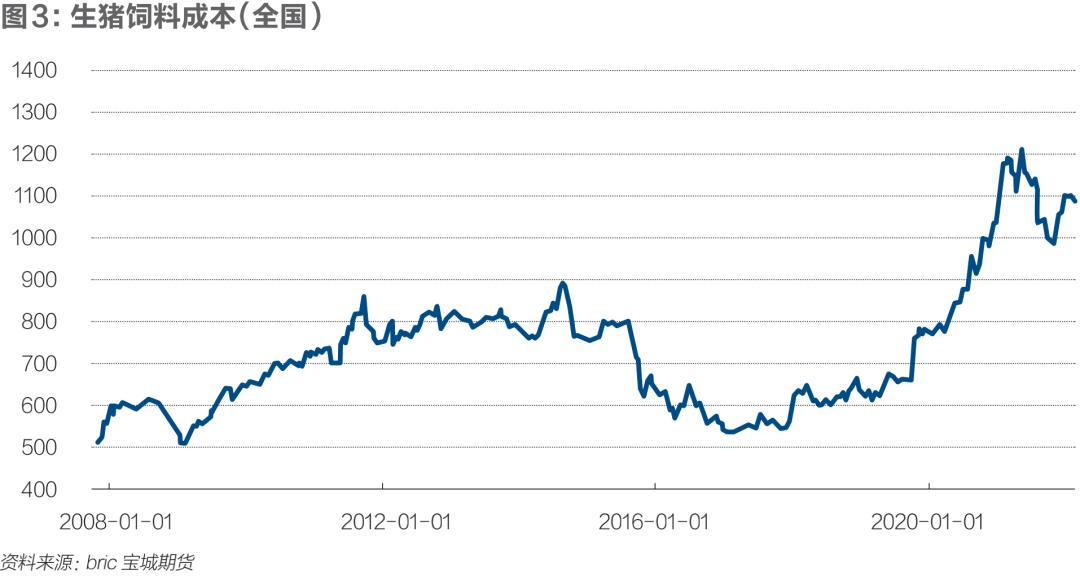玉米和豆粕是主要的猪饲料。受玉米进口预期下降的影响,国内玉米的价格也冲向高位。3月24日,玉米期货2209合约价格盘中触及3001元/吨,创历史新高,较2021年底的2671元/吨,上涨了12.35%。