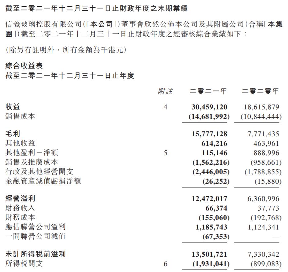 随着近日中国另一玻璃制造企业信义玻璃的业绩披露,媒体们用“玻璃大王换人了”这样的字眼来描述这样一个事实——信义玻璃(00868.HK)2021年营收达到304亿港元(约合246亿人民币),净利润达到115亿港元(约合93亿人民币),这是信义玻璃自2005年上市以来,业绩首次超越福耀玻璃(600660.SH)。