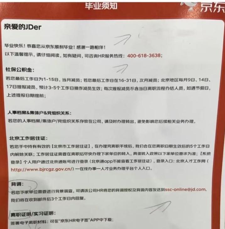 此外,还有网友晒出了致京东员工的“毕业须知”,页面开头写着“毕业快乐!恭喜您从京东顺利毕业!感谢一路相伴!”这样的祝福语。