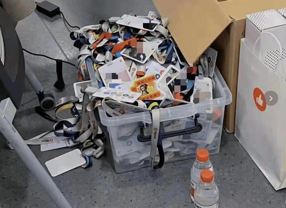配图显示,一个装满员工工牌的箱子放在地板上,有知情网友称是有赞裁员后留下的员工工牌,“电脑成排等待变卖,工卡遍地。”