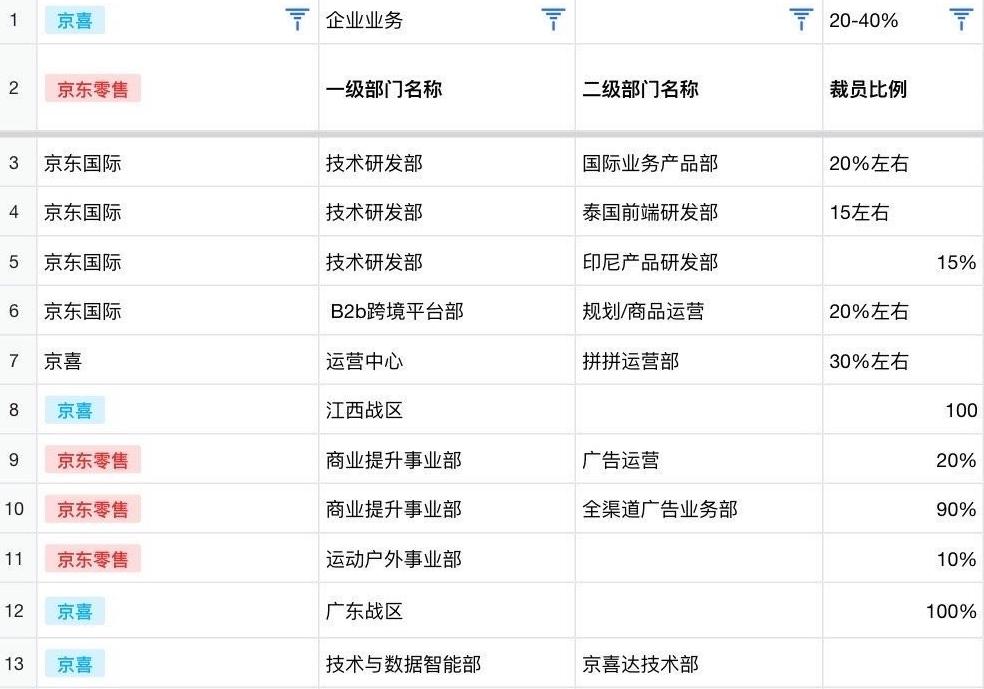 但随着消息发酵,外界发现京东的裁员范围远不止此。据网传的一份文档显示,此次裁员覆盖业务线较广,京喜、京东国际、京东零售、京东物流、京东科技等多个板块的多个事业部都设置了裁员比例,多数在10%-30之间,其中京喜四川、广东等多个战区裁员比例更是高达100%。