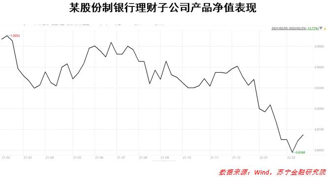 从以下图某股份制银行理财子公司某只产品净值表现来看,这类开放性的净值产品波动大,适用的风险等级高。该产品在2021年2月5日成立,在成立后近一年的时间内,亏损近20%,与同期沪深300指数跌幅为24%相类似。无论是产品定位还是产品投向、业绩表现都与市场中其他权益类产品并无二致。这类产品多数为开放型产品,净值真实体现了所投资产的市场价值,当投资者难以忍受产品净值的大幅度下跌时,部分会选择卖出止损。