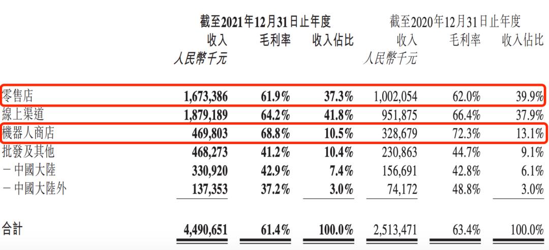 从渠道来看,泡泡玛特的钱主要来自线下 。财报显示,其在2021年全年的线下渠道收入占比依旧最高,达47.8%,但低于去年同期的53%;其线上渠道收入占比由2020年的37.9%上升至2021年的41.8%,但2021年整体收入不及线下渠道,毛利率不及机器人商店。