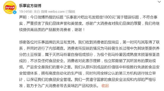3月27日,#乐事薯片吃出一撮毛发赔付1000元#空降微博热搜,引舆情发酵,随后,乐视官方称相关热搜标题不符合事实,所谓毛发只是土豆根茎,不涉及任何食品安全,难道是树大招风,乐事被人摆了一道?