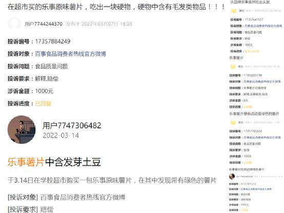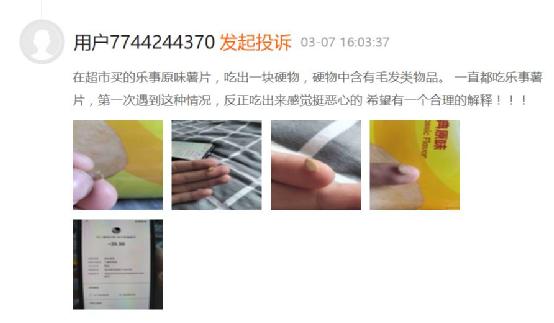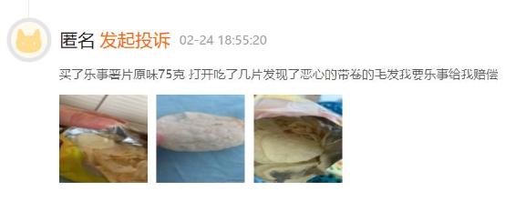2022年2月24日,有匿名用户在黑猫发起投诉称在乐事薯片75g的包装里,吃了几片后便发现了恶心的带卷的毛发