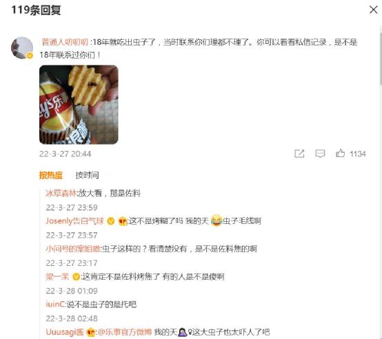 有网友表示,早在2018年,就在乐事薯片产品中吃出过虫子,但乐事理都未理,截至本文发稿,乐事并没有就该网友的现身说法的质疑作出任何回应。
