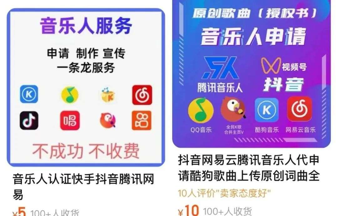 在拼多多、淘宝等平台,只需支付9.9到19.9不等的价格,就会有商家提供音乐人认证的服务。并且,还有商家出售低质量、残次的音乐作品的分轨文件用于参与各类扶持计划,从平台开出的扶持奖励中分得一杯羹。