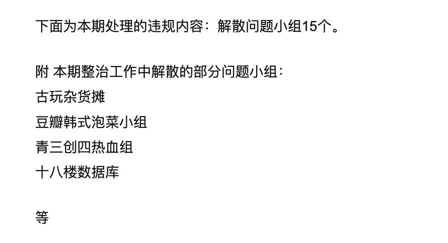 豆瓣本期整治工作中解散的问题小组为古玩杂货摊、豆瓣韩式泡菜小组、青三创四热血组、十八楼数据库等。