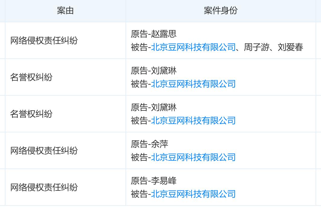 从天眼查可以看到,不少明星如井柏然、赵露思、李易峰、张艺兴等都因网络侵权责任纠纷将北京豆网科技有限公司(豆瓣公司主体)告上了法庭。
