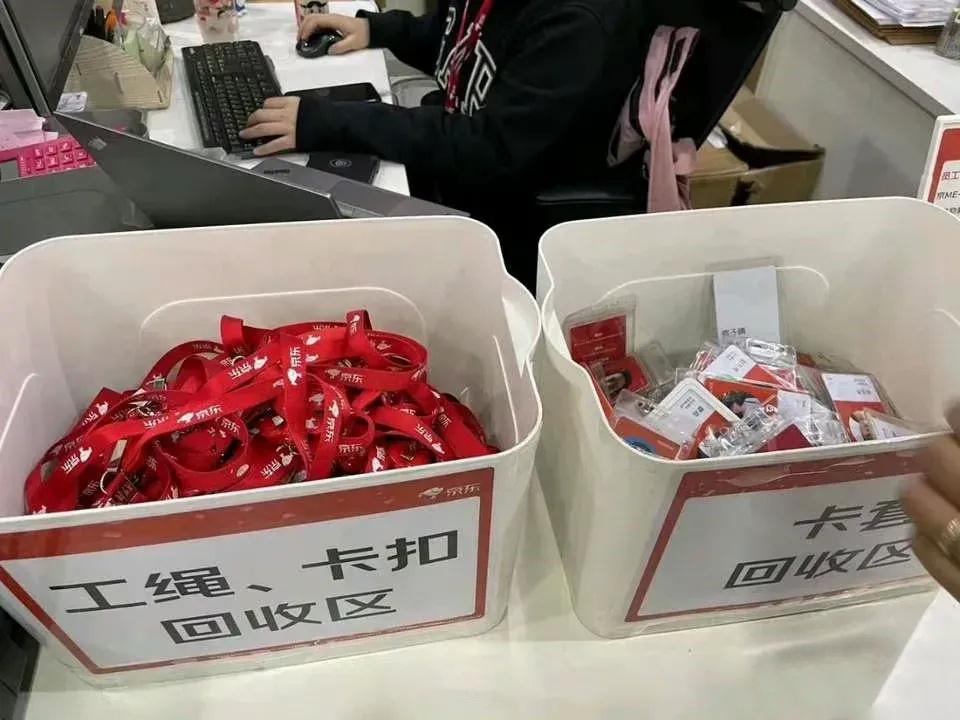 离职员工的工牌不仅装了一箱,甚至还溢了出去。近半层办公室空了出来,摆满了用过的显示器。