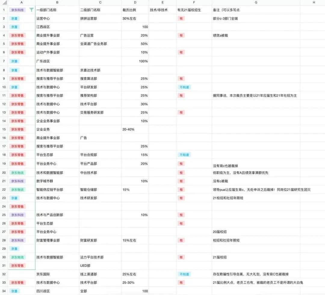 其中,京喜的江西和广东战区裁员比例更是高达100%。