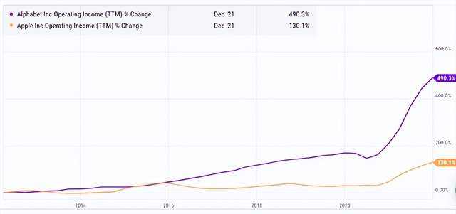 谷歌的表现与苹果公司有很大不同,苹果公司在5G iPhone之前的几年里,其营业收入停滞不前。