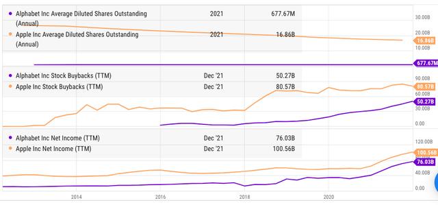 谷歌的净收入在最近几个季度大幅增长,这使得管理层能够在回购上花费更多。从上图可以看出,谷歌的回购步伐越来越接近苹果。