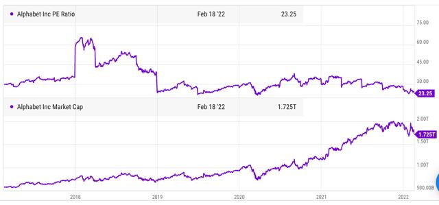 在过去几年中,Alphabet股票的交易价格一直是其市盈率的20至30倍。