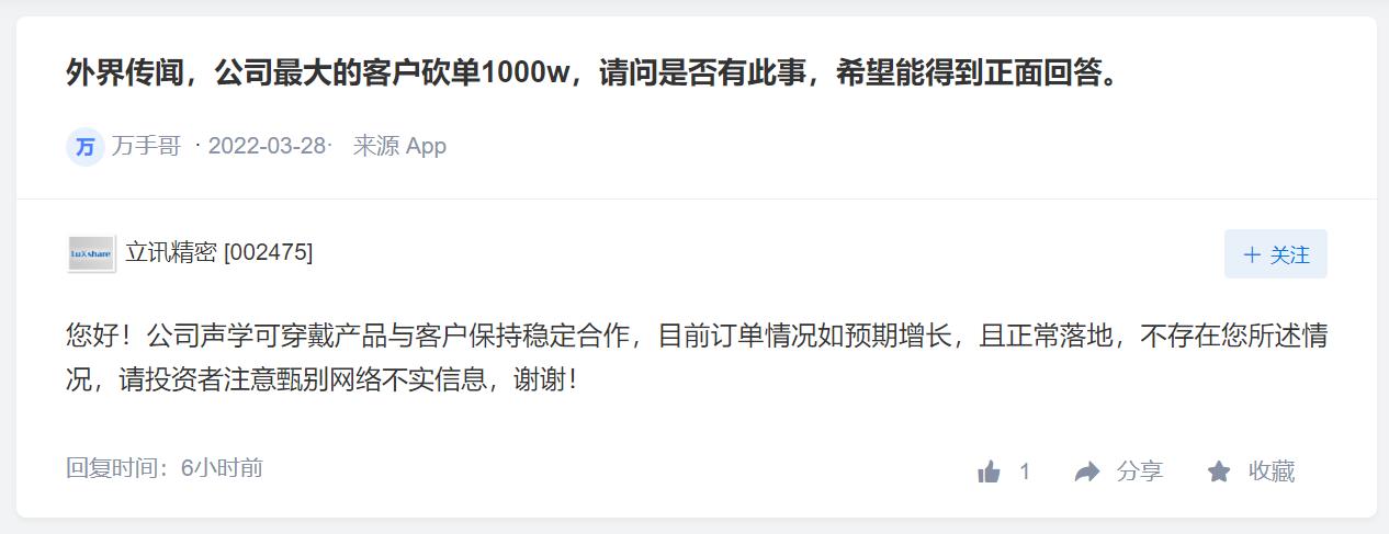 立讯精密亦在深交所互动易平台上称,“公司声学可穿戴产品与客户保持稳定合作,目前订单情况如预期增长,且正常落地。”