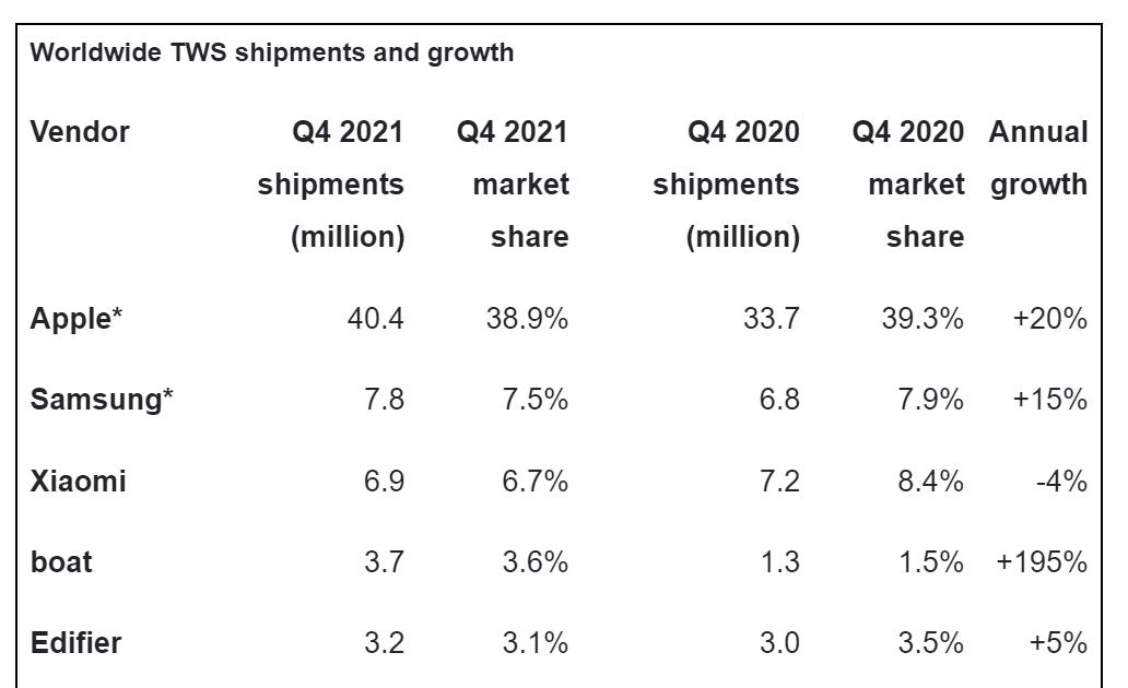此前,3月9日,Canalys最新统计数据显示,真无线蓝牙耳机 (TWS) 在2021年第四季度的出货量增长21%,达1.038亿部,首次突破了1亿部。其中,苹果公司推出第三代AirPods,推动了两位数增长的回归,其第四季度出货量达4040万部,市场份额达38.9%,位居榜首。