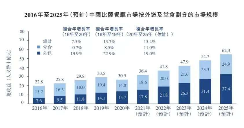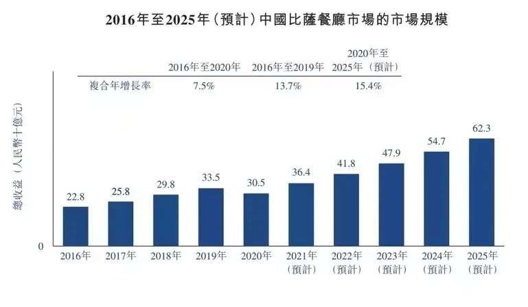 根据弗若斯特沙利文预测,2020年至2025年,中国比萨市场规模预计将以15.4%的复合年增长率增长,2025年将达到人民币623亿元。