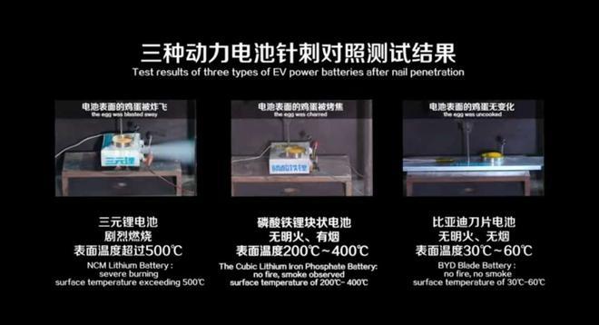 针刺实验中,刀片电池表现明显优于三元锂,也比普通的磷酸铁锂电池更安全