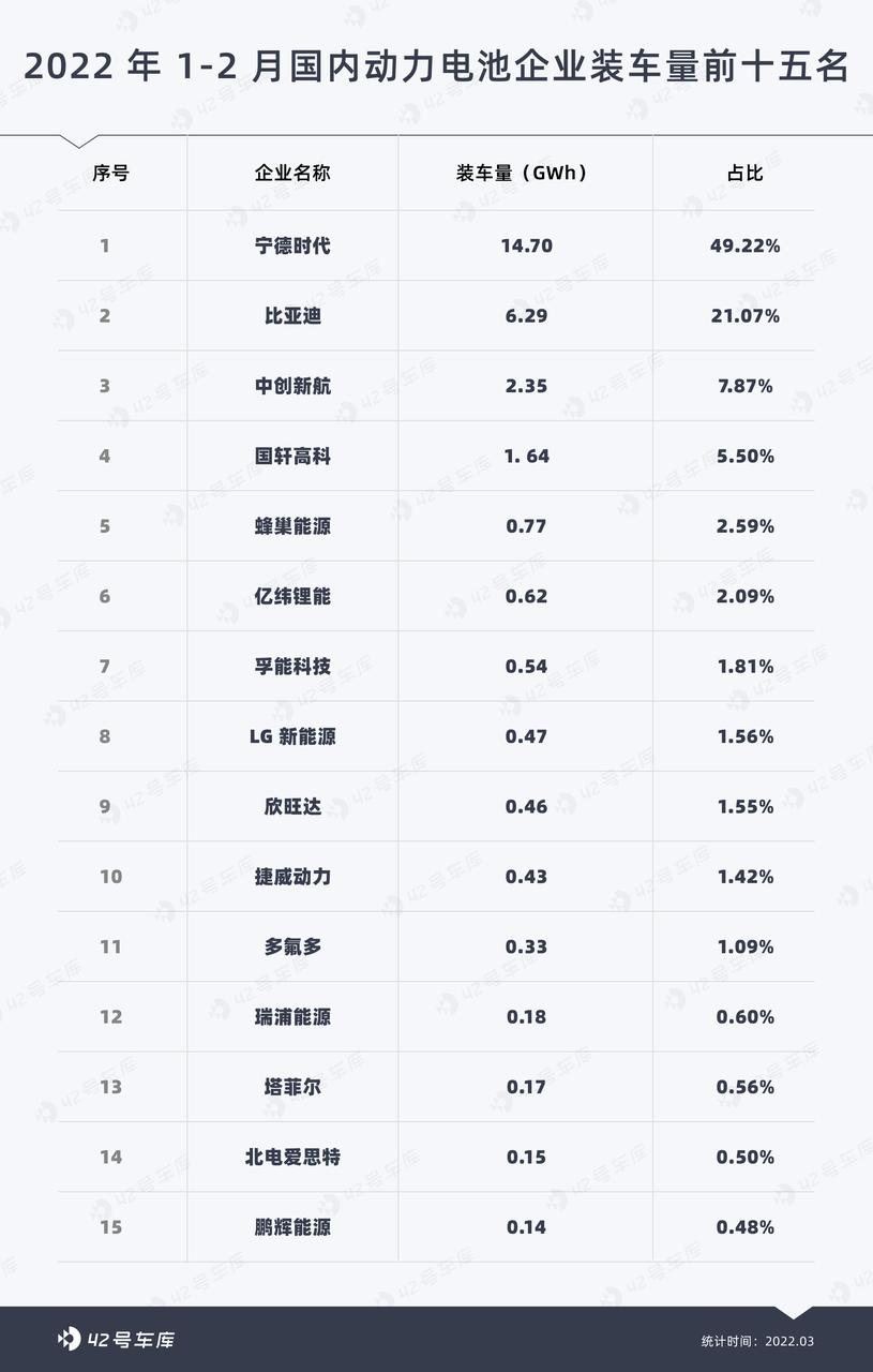 而作为多年专注于研究磷酸铁锂的比亚迪(当然也有三元锂电池,还供给了福特 Mustang Mach-E),今年 1—2月 比亚迪国内电池的份额超过 2 成来到 21.07%,与「宁王」的差距进一步缩小。