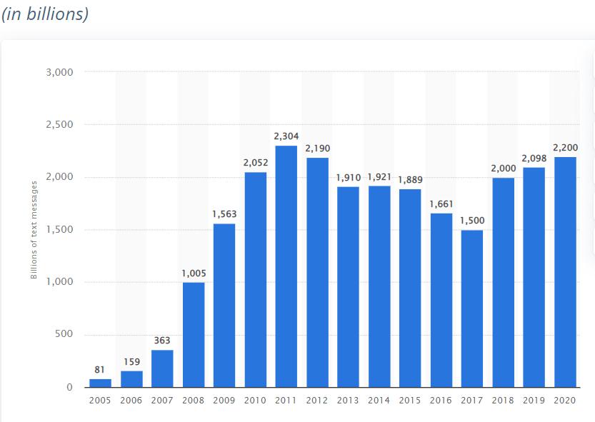 2005-2020 年美国 SMS 及 MMS 发送数量|来源:statista