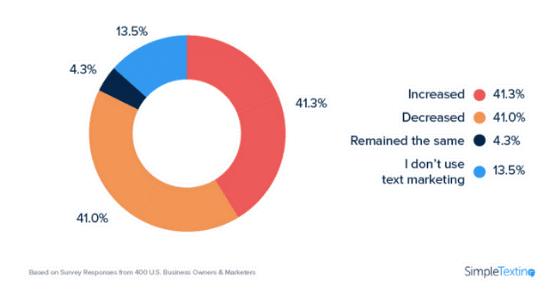 SimpleTextin 统计,2021 年提高 SMS 使用比重的企业占比 41.3%,不过减少 SMS 使用比重的企业也有 41%。看来,要有效发挥 SMS 的营销作用并不简单。