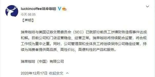 2021年,瑞幸咖啡与美国集体诉讼的原告代表签署了1.875亿美元(约合人民币12.1228亿元)的和解意向书。今年2月,瑞幸咖啡支付了这笔赔偿款。