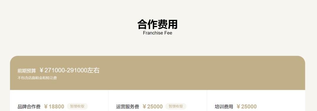 官网显示,除去店面租金和转让费,加盟费用在27~29万元之间,其中18800元的三年品牌合作费和25000元的运营服务费可以在开店13个月时缴足,如果在12个月内闭店,就免除这部分费用。