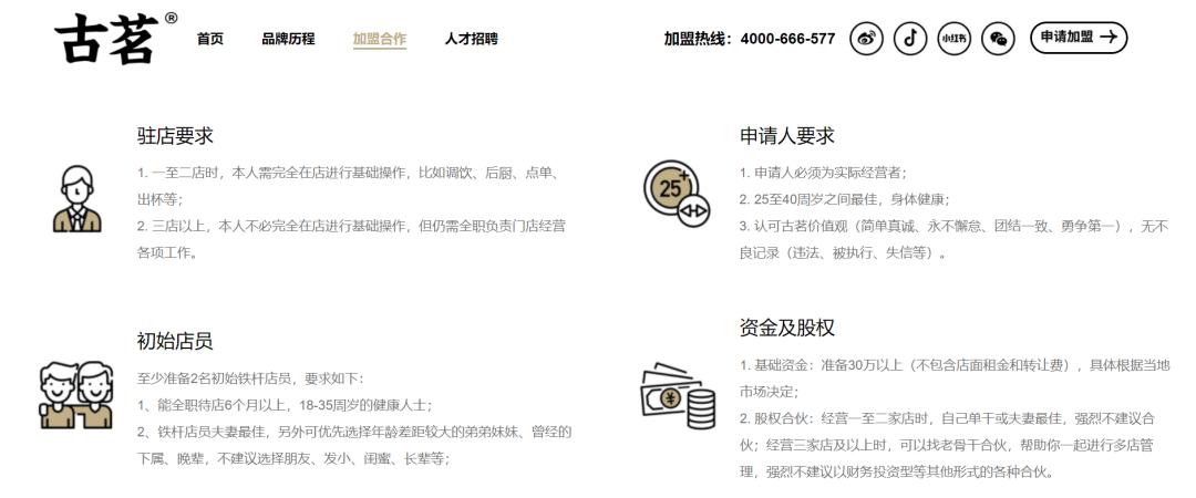 从2011年开始做起加盟的古茗,已经有一套非常成熟的打法和筛选机制:年龄在25至40周岁;一至二店时,投资者需要完全在店进行基础操作,三店及以上,投资者也需要全职负责门店经营工作;一到二店时不建议合伙。