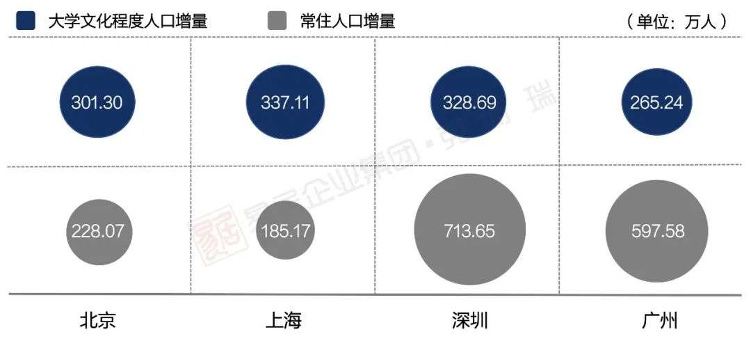 在全国老龄化加速、湾区城市承载资源有限的背景下,面临人口红利消退的局面,粤港澳大湾区提升人口质量成为人口建设的核心要务。从城市层面看,深圳、广州、珠海常住人口的受教育程度更高,每10万人口中拥有大学文化程度的人口分别为28849人、27277人和25752人。但对比四大一线城市的人才增量,京沪这两个强一线城市的人才增量明显大于人口增量,深圳、广州人才增量均远小于人口增量,大湾区城市的人才占比仍有较大的提升空间。