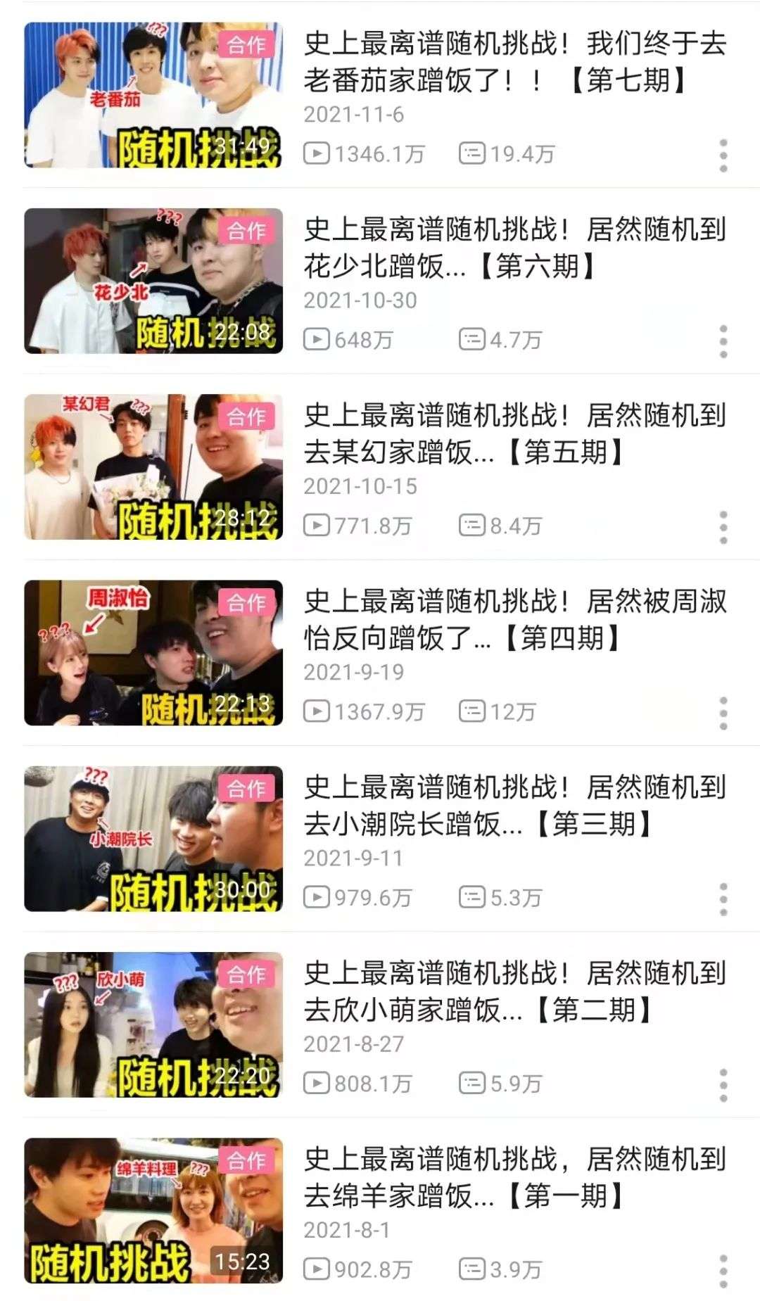 去年,UP主@雨哥到处跑 和@力元君 合作的视频栏目《随机蹭饭挑战》,通过随机抓阄的方式选择一名UP主去拜访蹭饭的方式,联动了“绵羊料理”、“老番茄”、“不2不叫周淑怡”等B站圈层熟知度高的UP主。