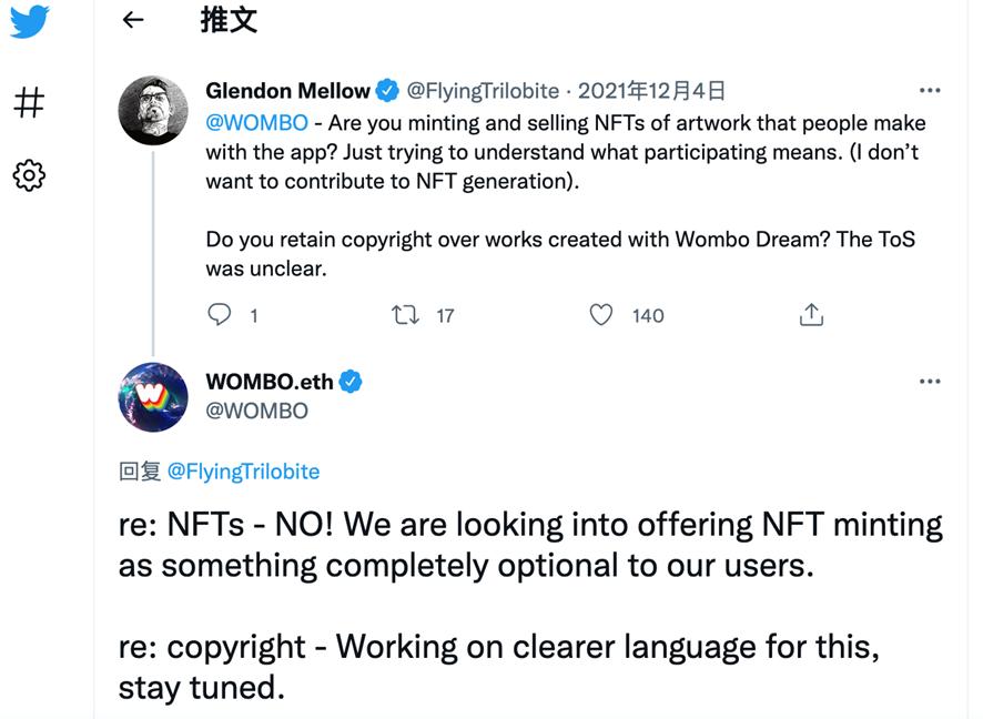 有用户发现,Wombo的官方推特名称以.eth 结尾,即以太坊的简称。因此质疑它是否计划把用户制作的图片,包装成NFT进行销售。