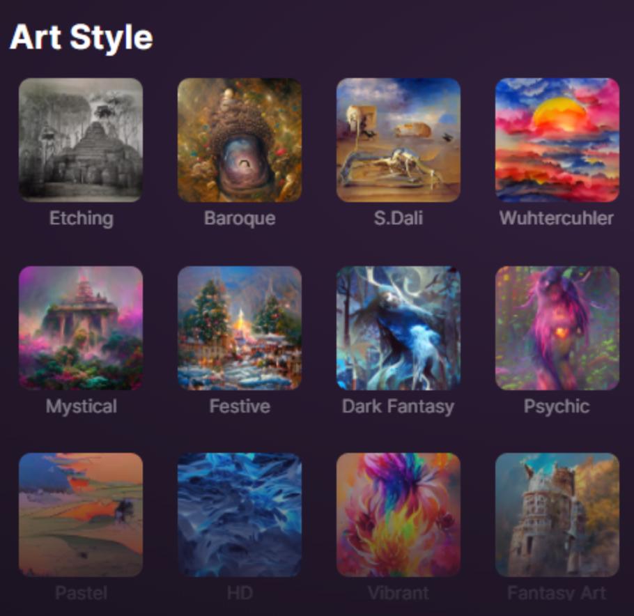 操作方法很简单。首先,在APP中随意输入一个关键词或一段描述,比如“元宇宙”。 再从中选择一个艺术风格,包括神秘、巴洛克、幻想艺术、蒸汽朋克等等。