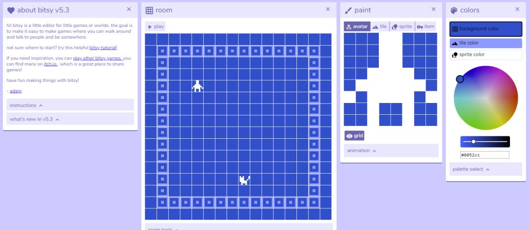 「Bitsy 是为了游戏、世界、故事而存在的编辑器,目标是让那种随便走走或者和别人交谈的游戏制作过程变得更简单。」