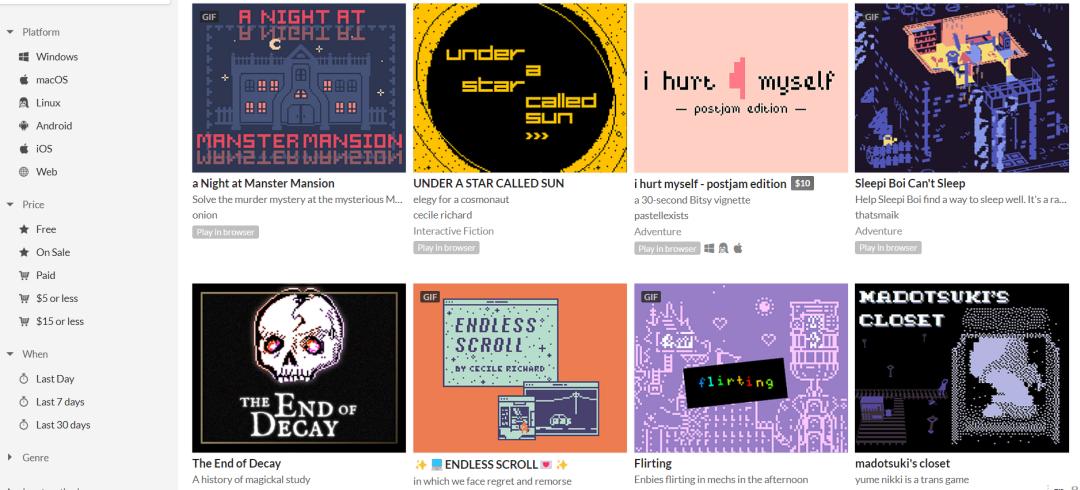 创始人亚当对游戏社区的推动是游戏工具突破瓶颈另一个重要因素,每月持续举办的主题游戏开发比赛(Game Jam)让开发者们能够不断将创意和行动互相分享,这种不掺杂商业属性的项目让所有人都聚焦于游戏创作和表达本身,正如亚当所说: